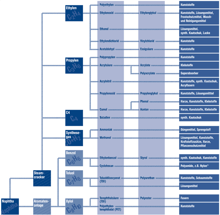 Im Bereich der organischen Basischemie werden sehr große Produktionsmengen in entsprechend dimensionierten Anlagen verarbeitet. Absorption, Adsorption, Rektifikation und Destillation gehören zu den eingesetzten Verfahren. Die hergestellten Stoffe bilden die Basis für eine Fülle von Kunststoffen und anderen Endprodukten.