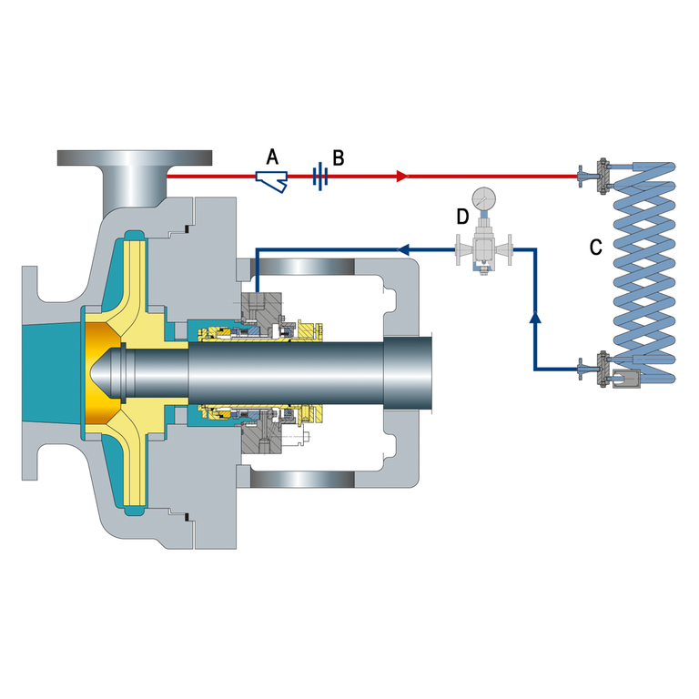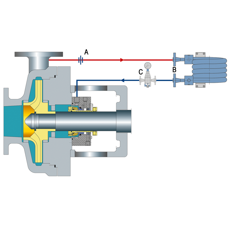 Recirculation from pump discharge through a flow control orifice and cooler into the seal chamber.