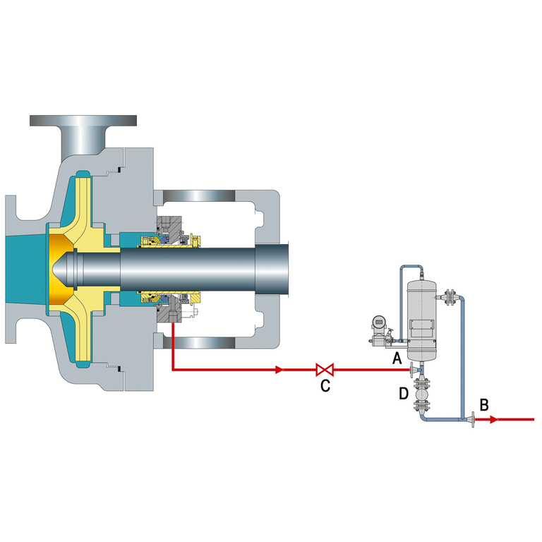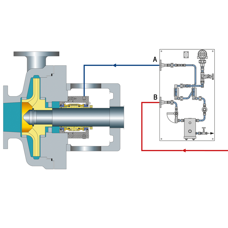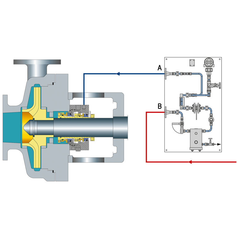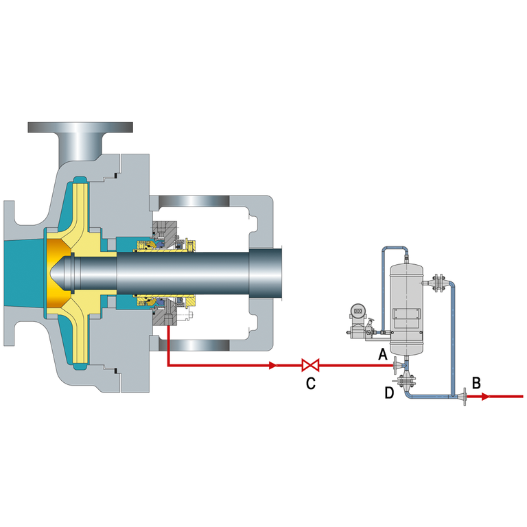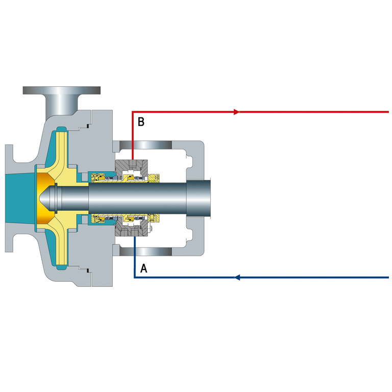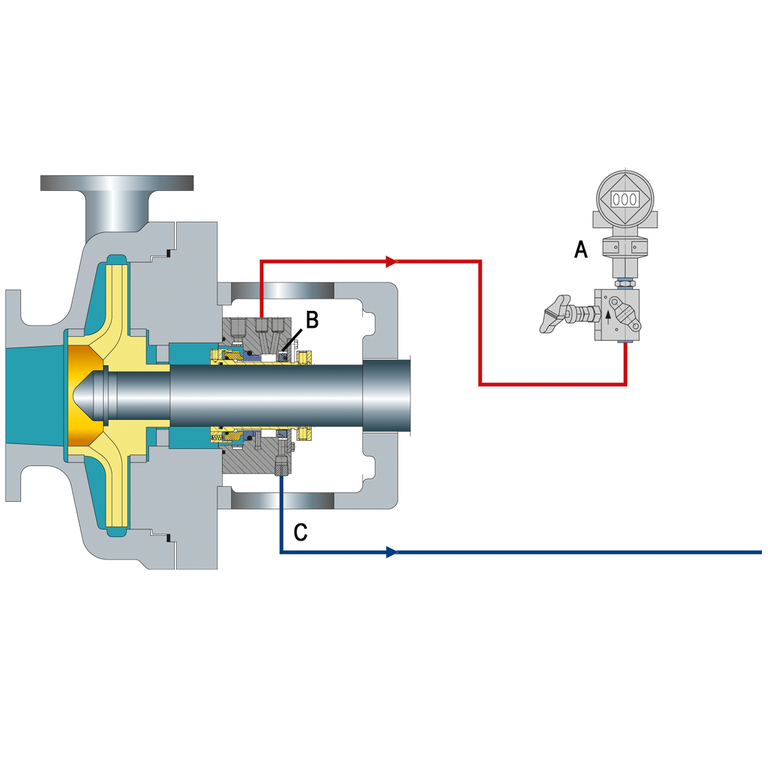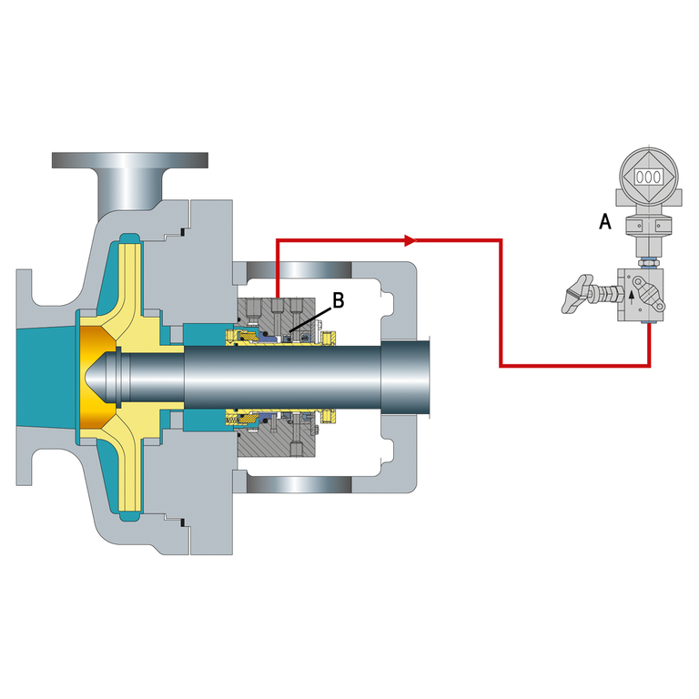 Throttle bushings in the seal gland minimize the seal leakage leaving the seal gland and allow for detection of a seal failure by an alarm of the monitoring pressure transmitter.